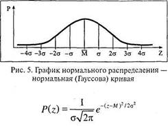 Мы уже знакомы с понятиями «распределение», «полигон» (или «частный полигон») и «кривая распределения». Частным случаем этих понятий является «нормальное распределение» и «нормальная кривая». Но этот частный вариант очень важен при анализе любых научных данных, в том числе и психологических. Дело в том, что нормальное распределение, изображаемое графически нормальной кривой, есть идеальное, редко встречающееся в объективной действительности распределение. Но его использование многократно облегчает и упрощает обработку и объяснение получаемых в натуре данных. Более того, только для нормального распределения приведенные коэффициенты корреляции имеют истолкование в качестве меры тесноты связи, в других случаях они такой функции не несут, а их вычисление приводит к труднообъяснимым парадоксам. В научных исследованиях обычно принимается допущение о нормальности распределения реальных данных и на этом основании производится их обработка, после чего уточняется и указывается, насколько реальное распределение отличается от нормального, для чего существует ряд специальных статистических приемов. Как правило, это допущение вполне приемлемо, так как большинство психических явлений и их характеристик имеют распределения, очень близкие к нормальному. Так что же такое нормальное распределение и каковы его особенности, привлекающие ученых? Нормальным называется такое распределение величины, при котором вероятность ее появления и не появления является одинаковой. Классическая иллюстрация – бросание монеты. Если монета правильна и броски выполняются одинаково, то выпадение «орла» или «решки» равновероятно. То есть «орел» с одинаковой вероятностью может выпасть и не выпасть, то же касается и «решки». Мы ввели понятие «вероятность». Уточним его. Вероятность – это ожидаемая частота наступления события (появления – не появления величины). Выражается вероятность через дробь, в числителе которой – число сбывшихся событий (частота), а в знаменателе – предельно возможное число этих событий. Когда выборка (число возможных случаев) ограниченна, то лучше говорить не о вероятности, а о частости, с которой мы уже знакомы. Вероятность предполагает бесконечное число проб. Но на практике эта тонкость часто игнорируется. Пристальный интерес математиков к теории вероятности в целом и к нормальному распределению в частности появляется в XVII веке в связи со стремлением участников азартных игр найти формулу максимального выигрыша при минимальном риске. Этими вопросами занялись знаменитые математики Я. Бернулли (1654-1705) и П. С. Лаплас (1749-1827). Первым математическое описание кривой, соединяющей отрезки диаграммы распределения вероятностей выпадения «орлов» при многократном бросании монет, дал Абрахам де Муавр (1667-1754). Эта кривая очень близка к нормальной кривой, точное описание которой дал великий математик К. Ф. Гаусс (1777-1855), чье имя она и носит поныне. График и формула нормальной (Гауссовой) кривой выглядит следующим образом.