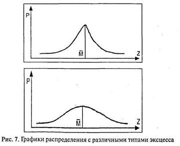 Рис. 6. Графики асимметричного распределения Асимметрия – третий показатель, описывающий распределение наряду с мерами центральной тенденции и изменчивостью. Эксцесс – показатель, характеризующий скорость нарастания концентрации данных к центральному значению. На графиках это выражается «островершинностью» или «плосковершинностью».