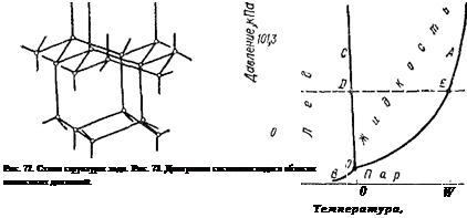Рис. 71. Схема строения молекулы воды. две электронные пары образуют ковалентные связи О—Н, а остальные четыре электрона представляют собой две неподелен-ных электронных пары. Как уже указывалось на стр. 132, атом кислорода в молекуле воды находится в состоянии 5р3-гибридизации. Поэтому валентный угол НОН (104,3°) близок к тетраэдрическому (109,5°). Электроны, образующие связи О—Н, смещены к более электроотрицательному атому кислорода. В результате атомы водорода приобретают эффективные положительные заряды, так что на этих атомах создаются два положительных полюса. Центры отрицательных зарядов неподеленных электронных пар атома кислорода, находящиеся на гибридных 5р3-орбиталях, смещены относительно ядра атома и создают два отрицательных полюса (рис. 71). Молекулярная масса парообразной воды равна 18 и отвечает ее простейшей формуле. Однако молекулярная масса жидкой воды, определяемая путем изучения ее растворов в других растворителях (см. § 80), оказывается более высокой. Это свидетельствует о том, что в жидкой воде происходит ассоциация молекул, т. е, соединение их в более сложные агрегаты. Такой вывод подтверждается и аномально высокими значениями температур плавления и кипения воды (см. рис. 57 на стр. 148). Как уже говорилось в § 47, ассоциация молекул воды вызвана образованием между ними водородных связей. В твердой воде (лед) атом кислорода каждой молекулы участвует в образовании двух водородных связей с соседними молекулами воды согласно схеме V V * • X .,.н н.. A X в которой водородные связи показаны пунктиром. Схема объемной структуры льда изображена на рис. 72. Образование водородных связей приводит к такому расположению молекул воды, при котором они соприкасаются друг с другом своими разноименными полюсами. Молекулы образуют слои, причем каждая из них связана с тремя молекулами, принадлежащими к тому же слою, и с одной — из соседнего слоя. Структура льда принадлежит к наименее плотным структурам, в ней существуют пустоты, размеры которых несколько превышают размеры молекулы Н20. При плавлении льда его структура разрушается. Но и в жидкой воде сохраняются водородные связи между молекулами: образуются ассоциаты — как бы обломки структуры льда, — состоящие из большего или меньшего числа молекул воды. Однако в отличие от льда каждый ассоциат существует очень короткое время: постоянно происходит разрушение одних и образование других агрегатов. В пустотах таких «ледяных» агрегатов могут размещаться одиночные молекулы воды; при этом упаковка молекул воды становится более плотной. Именно поэтому при плавлении льда объем, занимаемый водой, уменьшается, а ее плотность возрастает. По мере нагревания воды обломков структуры льда в ней становится все меньше, что приводит к дальнейшему повышению плотности воды. В интервале температур от 0 до 4 °С этот эффект преобладает над тепловым расширением, так что плотность воды продолжает возрастать. Однако при нагревании выше 4 °С преобладает влияние усиления теплового движения молекул и плотность воды уменьшается. Поэтому при 4°С вода обладает максимальной плотностью. При нагревании воды часть теплоты затрачивается на разрыв водородных связей (энергия разрыва водородной связи в воде составляет примерно 25 кДж/моль). Этим объясняется высокая теплоемкость воды. Водородные связи между молекулами 
