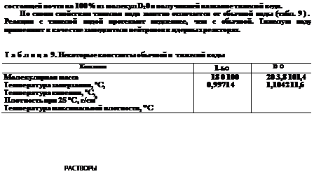 69. Вода в природе. Вода—"весьма распространенное на Земле Природная вода не бывает совершенно чистой. Наиболее чистой является дождевая вода, но и она содержит незначительные количества различных примесей, которые захватывает из воздуха. Количество примесей в пресных водах обычно лежит в пределах от 0,01 до 0,1 % (масс). Морская вода содержит 3,5 % (масс.) растворенных веществ, главную массу которых составляет хлорид натрия (поваренная соль). Вода, содержащая значительное количество солей кальция и магния, называется жесткой в отличие от мягкой воды, например дождевой. Жесткая вода дает мало пены с мылом, а на стенках котлов образует накипь. Подробнее о жесткости воды см. § 212. Чтобы освободить природную воду от взвешенных в ней частиц, ее фильтруют сквозь слой пористого вещества, например, угли, обожженной глины и т. п. При фильтровании больших количеств воды пользуются фильтрами из песка и гравия. Фильтры задерживают также большую часть бактерий. Кроме того, для обеззараживания питьевой воды ее хлорируют; для полной стерилизации воды требуется не более 0,7 г хлора на 1 т воды. Фильтрованием можно удалить из воды только нерастворимые примеси. Растворенные вещества удаляют из нее путем перегонки (дистилляции) или ионного обмена (см. § 212). Вода имеет очень большое значение в жизни растений, животных и человека. Согласно современным представлениям, само происхождение жизни связывается с морем. Во всяком организме вода представляет собой среду, в которой протекают химические процессы, обеспечивающие жизнедеятельность организма; кроме того, она сама принимает участие в целом ряде биохимических реакций. 70. Физические свойства воды. Чистая вода представляет собой максимальную плотность, и лишь при дальнейшем нагревании ее плотность уменьшается. Если бы при понижении температуры и при переходе из жидкого состояния в твердое плотность воды изменялась так же, как это происходит у подавляющего большинства веществ, то при приближении зимы поверхностные слои природных вод охлаждались бы до О °С и опускались на дно, освобождая место более теплым слоям, и так продолжалось бы до тех пор, пока вся масса водоема не приобрела бы температуру О °С. Далее вода начинала бы замерзать, образующиеся льдины погружались бы на дно и водоем промерзал бы на всю его глубину. При этом многие формы жизни в воде были бы невозможны. Но так как наибольшей плотности вода достигает при 4°С, то перемещение ее слоев, вызываемое охлаждением, заканчивается при достижении этой температуры, При дальнейшем понижении температуры охлажденный слой, обладающий меньшей плотностью, остается на поверхности, замерзает и тем самым защищает лежащие ниже слои от дальнейшего охлаждения и замерзания. Большое значение в жизни природы имеет и тот факт, что вода обладает аномально высокой теплоемкостью [4,18 Дж/(г-К)] *«Поэтому в ночное время, а также при переходе от лета к эиме вода остывает медленно, а днем или при переходе от зимы к лету так же медленно нагревается, являясь таким образом, регулятором температуры на земном шаре. В связи с тем, что при плавлении льда объем, занимаемый водой, уменьшается, давление понижает температуру плавления льда. Это вытекает из принципа Ле Шателье. Действительно, пусть лед и жидкая вода находятся в равновесии при О °С. При увеличении давления равновесие, со