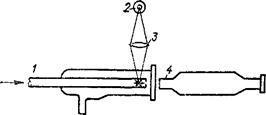 Рис. 92. Схема лоточного ультра-Микроскопа Б. В. Дерягина и Г. Я. Власенко: 1 — кювета; 2 — hci очник света; 5 — линза; 4 — тубус микроскопа. длины волны света. Если размеры частиц меньше половины длины волны света, то происходит рассеивание света в результате его дифракции. Область видимого света характеризуется длиной волн от 760 до 400 нм. Поэтому в молекулярных и коллоидных системах видимый свет рассеивается, а в проходящем свете эти растворы прозрачны. Наибольшей интенсивности рассеивание света достигает в коллоидных системах, для которых светорассеяние является характерной качественной особенностью. Обнаружение в растворе пути луча источника света при рассматривании раствора перпендикулярно к направлению этого луча позволяет отличить коллоидный раствор от истинного. На этом же принципе основано устройство ультрамикроскопа, в котором наблюдения проводят, в отличие от обычного микроскопа, перпендикулярно направлению проходящего через объект света. Схема поточного ультрамикроскопа Б. В. Дерягина и Г. Я. Власенко приведена на рис. 92. С помощью этого прибора определяют концентрацию дисперсных частиц в аэрозолях и коллоидных растворах. Форму коллоидных частиц, вирусов, многих макромолекул, включая молекулы более крупных белков, впервые оказалось возможным увидеть на флуоресцирующем экране и сфотографировать с помощью электронного микроскопа, изобретенного в конце 30-х годов XX века. Длина волны потока электронов при достаточной ускоряющей разности потенциалов имеет порядок Ю-10 м, что меньше размеров коллоидных частиц. Поэтому взаимодействие потока электронов с коллоидными частицами происходит по. законам геометрической оптики *. На рис. 93 показаны пределы применимости оптических методов исследования дисперсных систем. Коллоидные частицы проходят через бумажные фильтры, но задерживаются ультрафильтрами (мембранными фильтрами), представляющими собой гели полимеров в виде пленок. Зная радиус пор ультрафильтров, можно оценить размер коллоидных частиц. Молекулярно-кинетическими называют те свойства, которые связаны с хаотическим тепловым движением частиц, образующих те или иные системы. Различия в молекулярно-кине-тическом поведении молекулярно-, коллоидно- и микроскопически-дисперсных систем зависят от размеров частиц, образующих эти системы, и носят количественный характер.