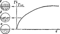 Рис. 96. Изотерма поверхностного избытка (Г) в растворах поверхностно-активного вещества. Структура поверхностного слоя: а — чистый растворитель; б — ненасыщенный моиомолекулярный слой ПАВ; в — насыщенный мономолекулярный слой ПАВ. ды. ПАВ первой подгруппы представляют собой ди-фильные молекулы с короткими углеводородными ра дикалами, а ПАВ второй подгруппы—дифильные молекулы с длинными углеводородными радикалами,.малорастворимые в воде. Разность концентраций растворенного вещества в поверхностном слое и в таком же слое внутри объема раствора называют поверхностным избытком этого вещества и обозначают греческой буквой Г («гамма»). ПАВ положительно адсорбируются в поверхностном слое и, следовательно, для них Г > О, поскольку это приводит к уменьшению поверхностного натяжения. Напротив, по-верхностно-инактивные вещества адсорбируются отрицательно, т. е. их концентрация в поверхностном слое меньше, чем в объеме раствора (Г<0). При этом поверхностное натяжение несколько возрастает в результате того, что в растворах сильных электролитов поверхностные молекулы воды втягиваются внутрь раствора с большей силой, чем в чистой воде. Пример изотермы адсорбции для поверхностно-активного вещества показан на рис. 96. Как видно, с увеличением концентрации раствора Г достигает предельного значения (Гоо), когда весь поверхностный слой занят молекулами ПАВ, вытеснившими молекулы растворителя. В таких насыщенных мономолекулярных поверхностных слоях молекулы ПАВ правильно ориентированы — своей полярной группой к полярной фазе (например, воде), а неполярным углеводородным радикалом — к неполярной фазе (например, воздуху), образуя подобие частокола. Аналогично изменяется пограничное натяжение и происходит адсорбция третьего компонента на границе двух несмешивающихся жидкостей. Адсорбция газов и паров на поверхности твердых тел также происходит в результате уменьшения свободной поверхностной энергии. Ввиду трудности измерения поверхностного натяжения твердых тел, об адсорбции на них судят, непосредственно определяя количество адсорбированного вещества. Последнее тем больше, чем больше поверхность адсорбента. Поэтому для осуществления адсорбционных процессов весьма важно создание высокопористых адсорбентов с развитой внутренней поверхностью, которую характеризуют удельной поверхностью, т. е. поверхностью, приходящейся на 1 г сорбента. Важнейшими пористыми сорбентами являются активный уголь и силикагель. Поглощающая способность угля подмечена еще в XVIII веке. Однако лишь в 1915 г. Н. Д. Зелинский* разработал способ получения активных углей, предложив их в качестве универсальных поглотителей отравляющих веществ, и совместно с Э. Л. Кумантом сконструировал угольный противогаз с резиновой маской. Один из первых способов активирования древесного угля состоял в обработке его перегретым паром для удаления смолистых веществ, образующихся при сухой перегонке древесины и заполняющих поры в обычном угле. Современные методы получения и исследования активных углей в нашей стране разработаны М. М. Дубининым **. Удельная поверхность активных углей достигает 1000 м2 на грамм. Активный уголь является гидрофобным адсорбентом, плохо поглощает пары воды и очень хорошо — углеводороды. Для поглощения паров воды широко применяют гидрофильный а