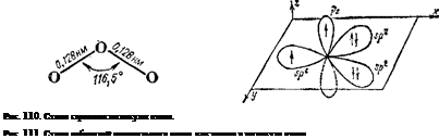 Растворимость озона в воде значительно больше, чем кислорода: 100 объемов воды при 0°С растворяют 49 объемов озона. Образование озона из кислорода можно выразить уравнением 30г = 203 —285 кДж из которого следует, что стандартная энтальпия образования озона положительна и равна 142,5 кДж/моль. Кроме того, как показывают коэффициенты уравнения, в ходе этой реакции из трех молекул газа получаются две молекулы, т. е. энтропия системы уменьшается. В итоге, стандартное изменение энергии Гиббса в рассматриваемой реакции также положительно (163 кДж/моль). Таким образом, реакция превращения кислорода в озон самопроизвольно протекать не может: для ее осуществления необходима затрата энергии. Обратная же реакция — распад озона — протекает самопроизвольно, так как в ходе этого процесса энергия Гиббса системы уменьшается. Иначе говоря, озон — неустойчивое вещество. Молекула озона построена в форме равнобедренного треугольника. Ее структура схематически изображена на рис. 110. Близость угла при вершине треугольника к 120° указывает на то, что центральный атом кислорода находится здесь в состоянии sp2-rn6-ридизации. В соответствии с этим, с позиций метода ВС образование молекулы 03 можно описать следующим образом. Гибридная 5,о2-орбиталь центрального атома, содержащая один электрон (рис. 111, слева), перекрывается с рх-орбиталью одного из крайних атомов кислорода, в результате чего образуется а-связь. Не участвующая в гибридизации /ь-орбиталь центрального атома, ориентированная перпендикулярно к плоскости молекулы и также содержащая неспаренный электрон, перекрывается с аналогично расположенной рг-орбиталью того же крайнего атома кислорода, что приводит к образованию л-связи. Наконец, выступая в качестве донора электронной пары, занимающей одну из гибридных «р2-орбиталей (рис. 111, справа), центральный атом кислорода образует по донорно-акцепторному способу а-связь с другим крайним атомом кислорода. Образовавшейся структуре соответствует валентная схема А, на которой точками обозначены неподеленные пары электронов, а а- и л-связи помечены буквами.
