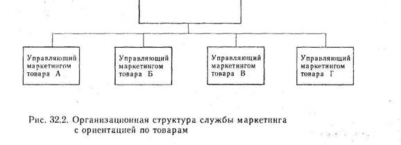 Рис. 32.1. Функциональная структура маркетинга Для предприятий, выпускающих большое количество разнообразной продукции, требующей специфических условий производства и сбыта, целесообразна организация маркетинга по товарному принципу (рис. 32.2). Она имеет ряд достоинств. Управляющий по определенному товару координирует весь комплекс маркетинга по этому товару и быстрее реагирует на возникающие на рынке проблемы. Такая маркетинговая структура обходится дороже, чем функциональная, поскольку требуется больше расходов на оплату труда из-за увеличения количества работников. Поэтому организация службы маркетинга по товарному принципу распространена только на крупных предприятиях, где \ объем продаж каждого товара достаточен для того, чтобы оправдать неизбежное дублирование в работе. Подобная маркетинговая структура в развитых странах имеет место в крупных децентрализованных компаниях, где каждый филиал специализируется на выпуске конкретного товара.