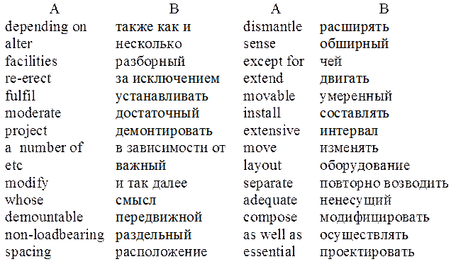 1. What does the more extensive use of steel in multi-storey buildings result from? 2. How can a longer useful life of a building be obtained? 3. How many degrees of flexibility are there? 4. What do they depend on? 5. How can the modification of the floor space be altered with the first degree of flexibility? 6. What is its difference from the second degree of flexibility? 7. Why must partitions be non-loadbearing in case of the second degree of flexibility? 8. What does the third degree of flexibility involve? 9. Which elements of a structure can be re-used for other purposes and in combination with other structures with the fourth degree of flexibility? 10. What does the fifth degree of flexibility mean? Лексическое упражнение В списке А даны некоторые слова и выражения, которые использованы в тексте для домашнего чтения. Найдите их перевод в списке В.