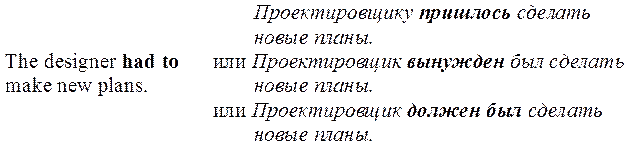 6.3.1 Модальные глаголы, выражающие долженствование 1. Must – должен. Долженствование не имеет дополнительных оттенков значения. The designer must make new plans. Проектировщик должен сделать новые планы. 2. Have to – должен, пришлось, вынужден. Долженствование – следствие внешних условий, обстоятельств.