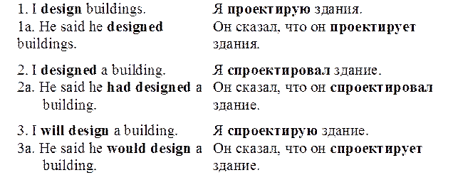 6.4 Согласование времён (Sequence of tenses) Правило согласования времён действует при передаче прямой речи в виде косвенной речи в форме сложноподчинённого предложения. Когда сказуемое главного предложения стоит в одном из прошедших времён, время сказуемого в придаточном предложении, в сравнении со временем предложения в прямой речи, сдвигается на один шаг в прошлое. Например: