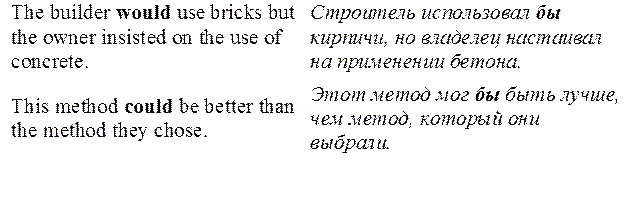 *Времена Future-in-the-Past образуются так же как времена Future, но вместо вспомогательного глагола will используется форма этого глагола - would. 6.5 Сослагательное наклонение (Subjunctive mood) Условные предложения II и III типа являются частным случаем использования сослагательного наклонения. Сослагательное наклонение характеризует действие как желательное или возможное при определённых условиях. В русском языке существует одна форма сослагательного наклонения, которая имеет в своем составе сочетание частицы бы с глаголом в прошедшем времени. В английском языке таким показателем является вспомогательный глагол would и глагол could в значении мог(ли) бы.