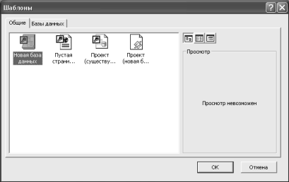 Рис. 58. Діалогове вікно Шаблоны, відкрите на вкладці Общие. Ця вкладка надає також спосіб створення нової порожньої бази даних