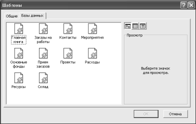 Рис. 59. Вкладка Бази данных діалогового вікна Шаблоны надає вам можливість вибрати один з 10 шаблонів, що поставляються з Microsoft Access