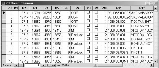 Імена полів формуються за правилом «P» + номер стовпчика на аркуші. Додатково до існуючого набору полів додається поле P0, що містить порядкові номери записів.