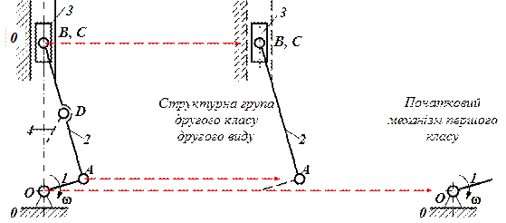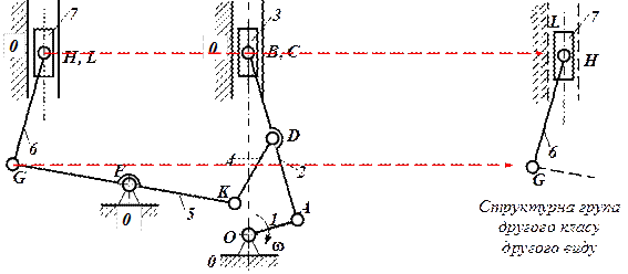 Рис. З. Отделение второй группы звеньев После отделения последней группы остается только начальный механизм первого класса (рис. З).
