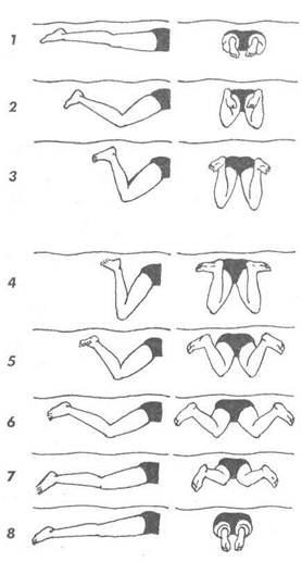 Рис. 17. Техника одновременных движений ногами при плавании брассом приближаются к ягодицам, голени почти перпендикулярны поверхности воды (через мгновение последует быстрый разворот стоп носками наружу и отталкивание назад). Подтягивание выполняется плавным движением с ускорением к моменту разворота стоп. Отталкивание (см. поз. 4—8 на рис. 17) — рабочая фаза движений. Она начинается мгновенным разворотом стоп носками наружу и энергичным движением стоп и голеней в стороны и назад-внутрь. Во время отталкивания стопы и голени хорошо опираются о воду, стопы движутся по дугам; ноги разгибаются в коленных и тазобедренных суставах. По завершении отталкивания ноги смыкаются и расслабляются, бедра направляются к поверхности воды. Затем следует непродолжительная пауза, во время которой пловец скользит вперед; ноги — у поверхности воды в хорошо обтекаемом положении.