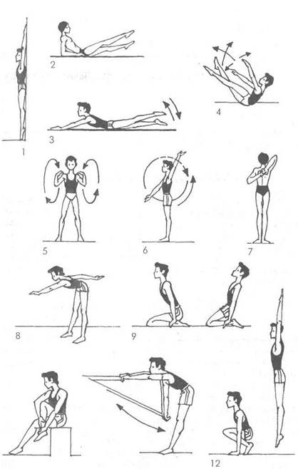 10 П Рис. 32. Примерный комплекс упражнений на суше 7. И. п. - основная стойка (о.с), руки сцеплены за спиной в «за 8. И.п. - стоя в наклоне вперед, ноги на ширине плеч, одна ру 9. И.п. — сед на пятках, носки оттянуты. Прогнуться назад и