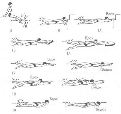 МЕТОДИКА ОБУЧЕНИЯ ТЕХНИКЕ СПОРТИВНЫХ СПОСОБОВ ПЛАВАНИЯ И СОВЕРШЕНСТВОВАНИЯ В НЕЙ Общие методические требования при обучении и совершенствовании техники плавания изложены в предыдущей главе (подраздел 5.1.5). Техника кроля на груди и на спине предъявляет повышенные требования к подвижности в плечевых и голеностопных суставах (подошвенное сгибание), а также к силовым качествам мышц плечевого пояса, участвующих в гребковых движениях. Ниже приведен примерный комплекс упражнений, выполняемых перед обучением и во время обучения технике плавания кролем на груди и на спине. Общеразвивающие, специальные и имитационные упражнения (рис. 32). Перед началом комплекса выполняются ходьба, прыжки, наклоны, приседания и отжимания. 1. Исходное положение (и.п.) - стоя спиной к стене, подняв ру 2. И.п. - сидя, упор руками сзади. Работа ногами, как при пла 3. И.п. - лежа на груди, руки вытянуты вперед. Работа ногами, 4. И.п. - сидя, приподняв ноги и вытянув руки вперед. Скрест 5. И.п. — стоя, согнув руки в локтях, кисти к плечам. Круговые 6. Круговые и попеременные движения обеими руками вперед