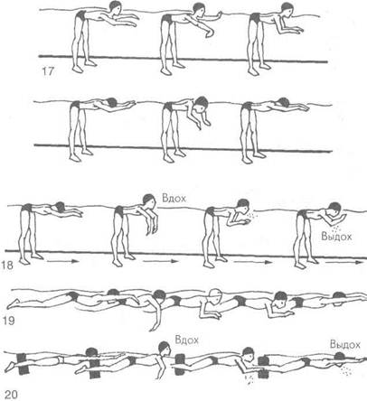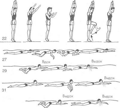 Рис. 42. Упражнения для изучения общего согласования движений 23. То же в согласовании с дыханием: вдох выполняется одно 24. То же в полной координации. Во время разведения рук в Упражнения в воде с неподвижной опорой 25. Упражнение в парах. Первые номера держат вторых сбоку за Упражнения в воде с подвижной опорой 26. Движения руками брассом в согласовании с дыханием, пе Упражнения в воде без опори 27. Плавание в полной координации на задержке дыхания. 28. Плавание с раздельной координацией движений (когда ру 29. Плавание с укороченными гребками руками в согласовании 30. Плавание в полной координации (ноги подтягиваются в 31. То же с «поздним» вдохом.." ■ "
