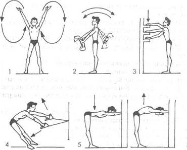 Техника баттерфляя предъявляет повышенные требования не только к подвижности в плечевых, голеностопных (подошвенное сгибание) суставах и позвоночника, но и к силовым характеристикам мышц плечевого пояса, туловища и нижних конечностей. Общеразвивающие, специальные и имитационные упражнения (рис. 43) Перед началом комплекса упражнений выполняются ходьба, прыжки, наклоны, приседания, отжимания. 1. И.п. — стоя, ноги на ширине плеч. Круговые движения пря 2. В положении стоя выкруты прямых рук вперед-назад с ис 3. И.п. — стоя у гимнастической стенки, опираясь руками о пе 4. Одновременные движения руками, как при плавании баттер 5. И.п. — стоя в наклоне у гимнастической стенки, ноги пря 6. В упоре лежа прогнувшись «волна» в различных вариантах. 7. И.п. — о.с, руки опущены. Максимально прогнуться назад, 8. И.п. — то же, руки на поясе. Поочередное вращение тазом