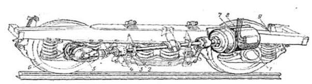 1-генератор; 2-скоба; 3-карданный вал; 4-резиновый шарнир; 5-редуктор; 6-колесная пара; 7-предохранительная скоба; 8-плита; 9-продольная балка