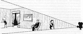 В зависимости от того, насколько фигура удалена от кино камеры, она изображается на картинной плоскости кадра в раз личных масштабах. Удаленность фигуры удобно обозначать чис лом фокусных расстояний объектива (F), которое помогает точнее определить масштаб (крупность) изображения. Если фигура расположена близко от аппарата (40 фокусных расстояний), на первом плане, и заполняет большую часть картин ной плоскости кадра, то такое изображение называют к р у п н ы м п л а н о м. Иногда крупный план актера называют порт ретным планом. Крупные планы в монтаже актерской сцены при меняются для выделения какого-либо действия актера, например, мимической игры. Если фигура расположена на первом плане,