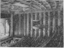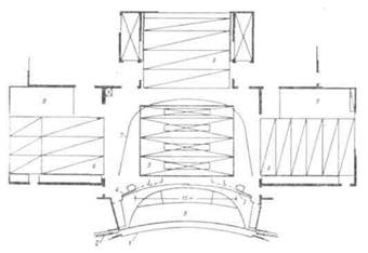 В этих театрах противопожарный огнестойкий занавес размещен в плоскости барьера оркестра. Таким образом, все пространство главной и передней сцены надежно изолируется от зрительного зала. Художники получили полную свободу в использовании авансцены. Противопожарный занавес оперного театра Лейпцига имеет еще одну особенность, отличающую его ¶от общепринятых конструкций. Вопреки традициям, он сделан не сплошной стеной, а разделен по высоте на две части. Верхняя, составляющая 7з высоты занавеса, поднимается наверх, проходя через щель в потолке зрительного зала. Подошва этой части обработана декоративно под потолок, и поэтому в поднятом виде занавес совершенно не заметен. Нижняя часть выступает над полом зрительного зала и служит барьером, ограждающим оркестровую яму (рис. 193). При закрытии занавеса обе части движутся навстречу друг другу, надежно перекрывая сцену. Оригинальная конструкция, получившая название «акулья пасть», помимо всего, значительно сократила время, необходимое для изоляции сцены, и обеспечила высокую степень безопасности для работающих на сцене людей. Как уже говорилось, авансцена театра Касселя имеет верхнее оборудование — штанкетные подъемы. Такая же механизация предусмотрена и в оперном театре Лейпцига. Применение штанкетных подъемов влечет за собой необходимость устройства колосников. Таким образом, коробка сцены заключает уже не только основную сценическую площадку, но и авансцену. Перенесение антрактового и огнестойкого занавесов, колосниковое оборудование фактически выдвигает портальную раму на линию барьера оркестра. Основная сцена как бы поглотила подмостки, находящиеся в зрительном зале. Из вспомогательной площади авансцена превратилась в полноценную игровую площадку. Правда, в большинстве случаев внешне авансцена сохранила свою форму — по бокам ее обрамляют стены, служащие продолжением стен зрительного зала, а верхнее пространство маскируется специальными щитами, сливающимися с потолочным перекрытием. При постановках с использованием штанкетных подъемов авансцены щиты поворачиваются вокруг горизонтальной оси или убираются совсем. Борьба за практическое освоение авансцены ведется параллельно с борьбой против портальной рамы и портальной стены. В старых театральных зданиях ширина раскрытия сцены всегда меньше ширины и высоты зрительного зала. Разграничение зрительного зала и сцены капитальной стеной с вырезанным в ней
