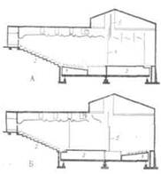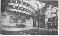 ¶ ¶Рис. 196. Театр Центра изящных искусств Кнокс-колледжа в США. Арх. Перкинс: а — вариант сцены-коробки со зрительным залом на 600 мест; б — вариант пространственной сцены со зрительным залом на 450 мест; 1 — поворотная часть амфитеатра; 2 — амфитеатр; 3 — сцена; 4 — занавес; 5 — экран Рис. 197. Театр Центра изящных искусств Кнокс-колледжа. Общий вид зала и сцены ¶335 ¶площадь соответствует площади всего партера и оркестровой ямы. Первый центральный подъемник играет роль трансформирующего оркестра. Второй — главный подъемник, а также два боковых несут подвижные платформы, на которых закреплены ряды партера. Боковые подъемники площадки, помимо этого, используются для заглубления зрительских мест при трехстороннем расположении зрителей вокруг сцены и для получения достаточной игровой площади при варианте «сцена-арена». Остановка и фиксация подъемников на различных уровнях осуществляется автоматически при помощи телекомандного устройства.