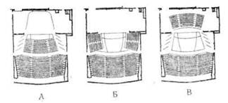 Рис. 199. Театр-студия Гарвардского университета. Варианты трансформации: а— сцена-коробка; б — пространственная сцена; в — арена ¶ронним расположением зрительских мест. Платформы партера передвигаются на глубинную сцену, а все подъемники составляют сценическую площадку центрального расположения. При всех видах трансформации сценическая коробка и амфитеатр остаются неизменными. Не изменяется и вместимость зрительного зала. Для трансформации не требуется дополнительное оборудование — все преобразования осуществляются из одних и тех же элементов, не требующих дополнительных площадей для складирования. Все это выгодно отличает данное решение трансформируемого театра (рис. 199). Как показывает практика работы универсальных трансформирующихся театров, для репертуарного театра, показывающего спектакли разных названий, решающим условием являются быстрота трансформации и минимальные затраты труда на перестройку сцены. Весьма поучителен в этом отношении опыт работы Малого театра в г. Мангейме, построенного архитектором Г. Вебером в 1955—1957 годах. Здание Мангеймского театра объединяет два зала — Большой и Малый. Большой театр со зрительным залом на 1200 мест оборудован механизированной сценой-коробкой. А Малый не имеет постоянной сцены и закрепленных зрительских мест (рис. 200, 201).