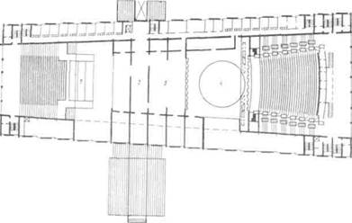 Трансформация заключается в перестановке сценической площадки и откатных трибун с местами в разные точки зала. В Мангеймском театре нет верхового оборудования, что не дает возможности применения подвесных декораций во всех вариантах открытой сцены. Расчет на одни лишь строенные детали декорации, стоящие на планшете, резко уменьшает постановочные возможности сцены и служит, может быть, косвен- ¶ной, но все же причиной редкого использования открытых площадок. Практика показала, что для репертуарного театра любая, даже механизированная перестройка весьма затруднительна, и театр в Мангейме пользуется ею в крайне редких случаях. Что касается условий восприятия, то при игре на открытой площадке обнаруживаются неожиданные явления, которые ставят под сомнение целесообразность некоторых вариантов размещения зрителей вокруг сцены. Так, было замечено, что при двухстороннем размещении, когда сцена разделяет зрительный зал на две части, актеры чаще обращаются лицом в ту сторону, где расположено большее количество зрителей.Следовательно, условия восприятия для зрителей, сидящих по ту и другую сторону сцены, являются неравноценными. Экспериментальный проект В. Быкова и И. Мальцина для Театра им. Маяковского в Москве тоже относится к числу универсального трансформируемого театрального пространства. На конкретное воплощение самой идеи существенное влияние оказали установки руководителя этого театра Н. Охлопкова. Принцип «взаимопроникновения пространств зрительного зала и сцены», волновавший художника, нашел свое отражение в экспериментальном проекте. Правда, здесь сохраняется развитая сцена-коробка, но все же основой решения театрального пространства является развитие действия в объеме зрительного зала, создание монументальных форм пространственной выразительности. Глубинная сцена секториальной формы снабжена барабанным поворотным кругом, системой подъемно-опускных площадок и накатных фур, с вписанными в них кругами меньшего диаметра (рис. 202). На одном уровне с планшетом сцены находится кольцевая сценическая площадка, так называемое кольцо внешних открытых сцен, опоясывающая весь зрительный зал. Перемены декораций на этом кольце производятся с помощью фурок, выкатываемых из карманов главной сцены. Пространство зрительного зала, вмещающего 2500 зрителей, заполнено системой поворотных кругов. Первый, самый малый,