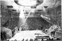Рис. 211. Театр Т. Гатри в Миннеаполисе. Общий вид. Арх. Р. Рапсон ¶площадка внутри сложного по форме амфитеатра (рис. 211). Задняя часть сцены перекрывается занавесом и служит местом для фоновых декораций. Резко очерченная линия обреза сценической площадки со ступенями, спускающимися в зрительный зал, акустические плоскости, подвешенные к потолку под разными углами, используемые для верхнего освещения, такие же угловатые линии построения амфитеатра, почти незаметно переходящего в балкон, все это в целом создает беспокойное впечатление. Популярность открытой сцены является одной из самых отличительных черт развития современного американского театра. По мнению американских специалистов, арена отличается не только более демократичным расположением мест, минимальным расстоянием между актером и зрителями, но и способствует развитию профессионального мастерства актера, требуя от него особой дисциплины, большой свободы движения в пространстве сцены. Художник, работающий на арене, ограничен куда более тесными рамками, чем на других сценах, и эти жесткие условия способствуют развитию его фантазии. Открытая сцена так же стимулирует фантазию зрителей. Главной силой своего театра американцы считают эксперименты в Сфере отношений актеров и зрителей и в меньшей степени в области перемен мест действия. Советские и большинство западноевропейских деятелей театра рассматривают арену как один из возможных вариантов решения театрального пространства, но не как единственную универсальную форму. Сила театра в его синтетичности. Лишать театр изобразительной среды, динамического развития действия, обогащенного движением элементов декораций, всех тех инструментов художественной выразительности, целенаправленно и дружно воздействующих на зрительское восприятие, значит, лишать театр его главнейших черт, его питательной среды. «Изобразительное искусство, — говорил Н. Акимов, — вошло в плоть и кровь театра не менее глубоко, чем музыка».1 Можно допустить арену в качестве площадки особого театра, особого творческого направления, театра экспериментального или учебного, но нельзя отдавать ей предпочтение перед другими формами сцены.