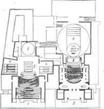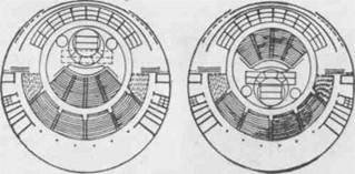 Родоначальником кольцевой сцены можно считать И. Фуртенбаха, который в 1663 году создал проект театра с четырьмя сценами, расположенными вокруг зрительного зала (рис. 212). Места для публики, сгруппированные в центре зала, поворачиваются, последовательно подвозя зрителей к каждой сцене. Правда, римский историк Плиний приводит