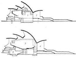 Рис. 207. Оперный театр в Сиднее. Макет. Арх. И. Утзон. 1973 ¶ 344 ¶ В 1957 году внимание архитекторов и театральных специалистов было привлечено к итогам международного конкурса на строительство здания Оперного театра в Сиднее, на который было представлено более двухсот проектов. Победителем конкурса был объявлен датский архитектор И. Утзон. Несмотря на то что в предложенном авторском варианте некоторые пункты задания не могли быть выполнены, жюри вынесло свое решение, посчитав, что выстроенный театр будет выдающимся произведением мировой архитектуры (рис. 207). Оригинальный замысел оказался сложным и противоречивым в воплощении. Архитектура во многом шла вразрез с функциональным предназначением сооружения. И все же в 1959 году, когда еще не были готовы полностью чертежи нижних этажей, состоялась закладка нового театра. Свой первый сезон оперой С. Прокофьева «Война и мир» театр открыл осенью 1973 года. Сиднейская опера — это не просто музыкальный театр, а комплекс театров и специализированных залов. Она объединяет оперный зал на 1550 мест, концертный на 2700 мест, малый зал для драматического театра на 550 мест, экспериментальный театр на 400 мест и 17 залов различного назначения, включая библиотеки, помещения для собраний и пр. (рис. 208). Пренебрегая шириной полуострова, отведенного под строительство, Утзон расположил две главные сцены рядом, соединив их продольными сторонами. Общая композиция здания от этого значительно выиграла. Несмотря на то что частично пришлось выйти за пределы суши, для сценических карманов места не хватило. Отсутствие боковых пространств привело