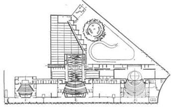 Рис. 208. Оперный театр в Сиднее. Разрез: 1 — оперный театр; 2— фойе оперного театра; 3 — концертный зал; 4 — фойе; 5 — драматический театр ¶345 ¶к решению механизации сцены по принципу вертикального перемещения. Сцена Оперного театра механизирована поворотным кругом с кольцом. Глубина сцены 28 м, ширина 29 м, высота до колосников 24 м. Драматическая сцена имеет поворотный круг, портальные башни, горизонт и прочее технологическое оборудование. На арьерсцене расположены две опускные платформы для транспортировки декораций из трюма, где находятся склады и мастерские обеих сцен. Первый опыт проектирования театрального комплекса в Советском Союзе принадлежит группе челябинских архитекторов. В основу челябинского комплекса положен принцип совмещения автономной работы каждого театра с возможностью объединения их как в административно-организационном плане, так и функциональном. Все части комплекса расположены на одной линии по параллельным осям. Зрительские фойе, декорационные склады, цеха и пр., соприкасаясь друг с другом, представляют, в сущности, единое помещение с необходимой изоляцией для одновременной самостоятельной работы каждого театра (рис. 209).