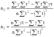 При сглаживании ряда динамики по показательной кривой (yt=a0a1t) для определения параметров применяется метод наименьших квадратов к логарифмам исходных данных. Так, для нахождения параметров показательной функции необходимо решить следующую систему уравнений: