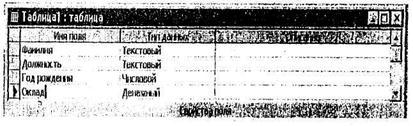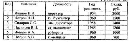 Рис.1. Структура базы данных 3. Нажмитекнопку Закрыть <Х> в левом верхнем углу окна. В ответ на вопрос "Сохранить изменения макета или структуры таблицы Таблица1?" нажмите кнопку <Да>. Для сохранении текстатаблицы под именем Таблица 1нажмите кнопку <ОК>. На вопрос "Создать ключевое поле сейчас?" ответите <Да>. 4. Заполнитебазу данных конкретными данными. Для этого в окне БД выделите строку Таблица1 и на напели инструментовэтого окна нажмите кнопку <Открыть>. В появившеесяокно последовательновведитеданные, приведенные втабл.1. Столбец Код заполняетсяавтоматически числам натурального ряда. Таблица 1.