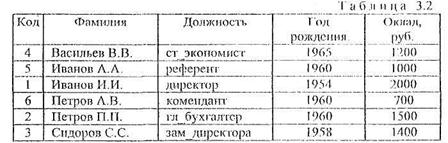 6. Уничтожьте одну из записей в базе данных. Для этого: § в окне БД нажмите кнопку <Открыть>, выберите в таблице нужную строку (например, последнюю) и выделите ее щелкнув по началу этой строки курсором мыши; § нажмите клавишу [Delete]и подтвердите намерение, кнопкой <Да>. 7. Произведите сортировку базы данных по алфавиту. Выделите столбец с фамилиями и щелкните по кнопке <А/Я↓>. Результаты сортировки показаны в табл. 2.