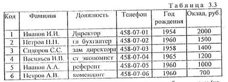 8. Произведите сортировку 6азы данныхпо годам рождении: § выделитенужный столбец и подайте команду Записи/Сортировка/Сортировка по возрастанию или Сортировка по убыванию. § Закройте таблицу. 9. Изменитеструктуру базыданных: § в окне БД выберите режимТаблицы инажмите напанели инструментов кнопку < Конструктор >. Появится окно структуры таблицы; § вставьтепустую строкупосле строкиДолжность; для этоговыделитестроку Год рождения и подайтекоманду Вставка/Строки; § введитев новую строку запись: Телефон, Текстовый»; § Закройте таблицу; вответна вопрос " Сохранить изменения макета или структуры таблицы “ Таблица 1" нажмите кнопку < Да >. 10. Откройте таблицу. Введитеномерателефонов в соответствующийстолбец. Результатпредставленв табл. 3. Закройте таблицу. 11. Найдитезаписипо какому-либо признаку (например, по фамилии): § откройтетаблицу базы данных; выделите столбец с фамилиями; подайте команду Правка/Найти; § появившееся окно Поиск и замена опустите за заголовок вниз так, чтобы была видна таблица; в окошко Поиск введите образец для поиска (например, Иванов ); § в раскрывающемсясписке "поиск в:" выберите строку "Таблица 1"; в списке "Совпадение" установитеусловие совпадения (например, "сначала поля"); § нажмитекнопку <Найти далее >. В таблице базы данных выделится фамилия ИвановИ.И; § снова нажмитекнопку < Найтидалее>. В таблицебазы данных выделится фамилияИванов А.А.; § еще раз нажмите кнопку <Найти далее >. Появитсясообщение «Поиск записей вприложенииMicrosoft Access завершен. Образец не найден»; § нажмите кнопку < ОК >. Закройтеокно «Поиск и замена» и окно «Таблица 1».