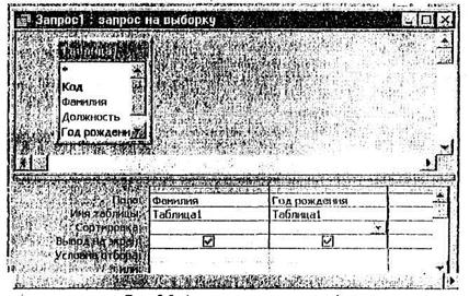 Рис. 2. Формирование запроса 1 § на панели инструментов нажмите кнопку < Открыть>. Появитсяокно, содержащее таблицу с запрашиваемыми данными. § Закройте запрос с охранением. § Откройте запрос 1 в режиме таблицы и проверьте его правильность. 4. Составьте выборку из таблицы баз данных, содержащую фамилии тех сотрудников, которые родились позже 1959г. и получают оклад менее 1100 руб: § Создайте запрос 2 на основе Таблицы 1; § введите в нижней части окна “Запрос 2: запрос навыборку" в первую ячейку строки Поле слово "Фамилия", во вторую ячейку той же строки слова"Год рождения", а в третьюячейку – слово "Оклад"; § введите во вторую колонку в строку Условия отбора условие >1959, а в третью колонку этой же строки – условие <1100; § закройте запрос с сохранением. § Откройте запрос 2 в режиме таблицы и проверьте его правильность.