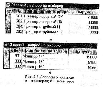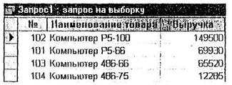 4. В диалоговом окне «Импорт электронной таблицы»выполните следующие действия: § выберите вариант "листы" — Лист1 и нажмитекнопку <Далее>; § установите флажок [Ö] в строке "Первая строка содержитзаголовки столбцов" и нажмите кнопку <Далее>; § выберите вариант "Данные сохранить" "в новой таблице" и нажмите кнопку <Далее>; § в строке "Описание поля [№]" снимите флажок[ ]"не импортировать" и нажмите кнопку <Далее>; § выберитевариант "определитьключ", введите в качествеключа имя поля "№" и нажмите кнопку <Далее>; § выберитевариант "Импорт и таблицу" Лист1, нажмитекнопку <Готово>, а затем кнопку <ОК>. 5. В окне «База данных» выделитестроку "Лист1" и нажмите кнопку < Открыть >. Откроется таблица с данными. Для удобствадальнейшего использования произведитеформатирование таблицы и подайтекоманду Закрыть. 6. Перейдите к созданию запросов, касающихся содержания таблицы. Запрос 1 должен представлять сведения о выручке от продажи компьютеров, Запрос 2 - от продажи принтеров, а Запрос 3 от продажи мониторов. 7. Для создания первогозапроса выполните следующие действия: § в окне БД выберите режим 'Создание запроса в режиме конструктора" и нажмите кнопку <Конструктор>; § в диалоговом окне «Добавление таблицы» нажмите кнопки <Добавить> и < Закрыть >; § в диалоговом окне «Запрос 1: запрос на выборку» установите содержание полей: 1. первое поле: №; условие отбора: <200; 2. второе поле: Наименовании товара; 3. третье поле: Выручка;сортировка; "по убыванию"; § подайте команду Закрыть; § сохраните имя запроса"Запрос 1" нажатием кнопки <ОК> § в окне БД выделите строку "Запрос 1" и нажмите кнопку <Открыть>; на экране появится таблица с Запросом 1.