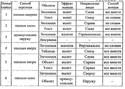 Демонстрация презентации 1. С помощью клавиши [PgVp] выведитена экранчерный слайд. Подайте команду Показ слайдов/Начать показ или нажмите клавишу [F5]. 2. Во время демонстрации для выводяследующей строкитекста и для перехода к следующему слайду нажинайте новуюклавишу мыши. 3. Разработайте вариант программыдля демонстрациислайдов в автоматизированном режиме. Для этого: § • создайте копню файла с другим именем; § • подайте команду Показ слайда/Смена слайда; и появившемся диалоговом окне снимите флажок [Ö] со строки "По щелчкумыши" и установите флажок [Ö]в строке "Автоматически после"; в небольшое окно ниже этой строки введите интервал в минутах и секундах (например, 00:05); нажмитекнопку <Применить> ко всем>; Таблица 4.1