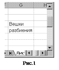 Работа с окнами Разделение окон Иногда необходимо одновременно просматривать различные части большой таблицы. Для этого следует разделить окно таблицы на подокна одним из следующих способов. ¯ Установить указатель мыши на горизонтальную или вертикальную вешку разбиения (рис.28) (он примет вид двунаправленной стрелки) и перетянуть в нужное место. Размеры подокон можно изменять, перетягивая вешку разбиения. ¯