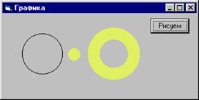Private Sub Command1_Click() 'точка и окружность - тонкие, черные PSet (300, 1000) Circle (1000, 1000), 500 'изменение толщины линий DrawWidth = 20 'изменение цвета линий ForeColor = RGB(230, 250, 100) 'точка и окружность - толстые и цветные PSet (1800, 1000) Circle (2800, 1000), 500 End Sub