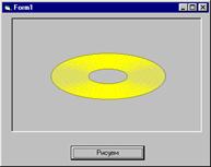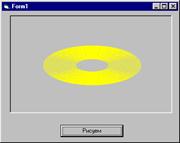 Пример. Нарисовать «компакт-диск» или «летающую тарелку». Радиус самого маленького круга взять 500, самого большого – во все графическое окно, радиусы соседних окружностей различаются на 10 – 30 твипов, цвет – желтый, коэффициент сжатия окружности взять меньше 1 – получится эллипс, сжатый по вертикали. Внутреннюю и внешнюю обводку сделать другого цвета.
