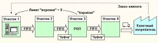 Рис.9. Структура метода "Барабан-Буфер-Веревка" (DBR).