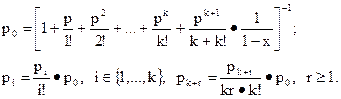 Пример. Дисплейный зал имеет k дисплеев. Поток пользователей простейший. Среднее число пользователей, посещающих дисплейный зал за сутки, равно п. Время обработки информации одним пользователем на одном дисплее распределено по показательному закону и составляет в среднем t мин. Определить, существует ли стационарный режим работы зала; вероятность того, что пользователь застанет все дисплеи занятыми; среднее число пользователей в очереди; среднее время ожидания свободного дисплея; среднее время пребывания пользователя в дисплейном зале.