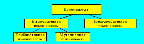 Совокупность различий по тому или иному признаку между живыми организмами, принадлежащими к одной и той же природной популяции или виду, называется изменчивостью. По механизмам возникновения и характеру изменений признаков генетика различает основные формы изменчивости: наследственную (генотипическую), и – ненаследственную (модификационную, или фенотипическую). Под генотипом понимают наследственную структуру организма. Понятие же фенотипа обозначает совокупность доступных наблюдений индивидуальных признаков особи. Изменчивость, связанная с изменением фенотипа в результате воздействия окружающей среды, без изменения генотипа, называется ненаследственной, или модификационной изменчивостью. Дарвин назвал модификационную изменчивость определенной, т.к. все особи данного вида, попав в сходные условия, изменяются одинаково, т.е. такая изменчивость предсказуема. Например, все овцы, выращиваемые в более холодных условиях, будут иметь более густую шерсть. Изменчивость, связанная с изменением генотипа, называется генотипической изменчивостью. Генотипическая изменчивость передается по наследству, и подразделяется на комбинативную и мутационную (рис. 5.2.).