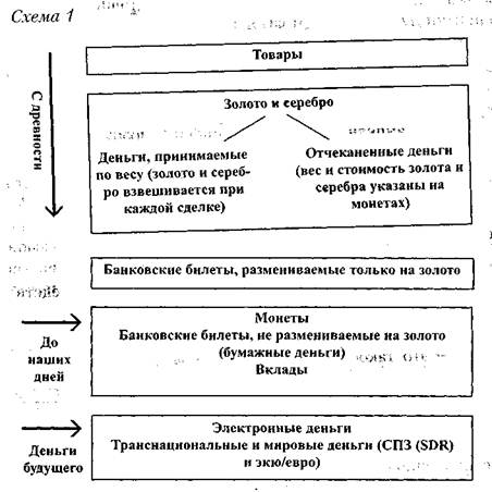 Деньги - это исторически определенная форма экономических, т.е. общественно-производственных отношений между людьми в процессе товарного обмена. Происхождение денег и их качественную эволюцию можно условно проследить по следующим схемам: