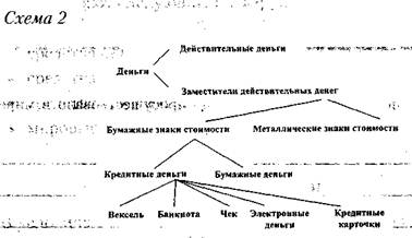 Деньги бывают двух видов: 1) действительные (полноценные); 2) знаки стоимости. Действительные деньги - это деньги, номинальная стоимость которых соответствует стоимости металла, из которого они изготовлены. Знаки стоимости (заместители действительных денег) - деньги, номинальная стоимость которых выше реальной. К ним относятся металлические знаки стоимости и бумажные знаки стоимости. Различают бумажные и кредитные деньги. Бумажные деньги - это средства платежа и средства обращения.