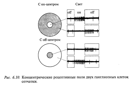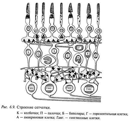 Оптика глаза создает на сетчатке изображение, а при помощи аккомодации это изображение становится резким. На первом этапе зрительного восприятия световая энергия трансформируется в нервное возбуждение. Этот процесс происходит в наружных члениках фоторецепторов, содержащих фотопигмент: в колбочках - йодопсин, в палочках - родопсин. Молекула фотопигмента состоит из белковой части - опсина и части, поглощающей свет - хромофора. По химическому составу хромофор является альдегидом витамина А., Поэтому недостаток витамина А в пище приводит к ухудшению зрения в сумерках (так называемая «куриная слепота»). Колбочки и палочки отличаются друг от друга по структуре и зрительным пигментам, а также по некоторым особенностям функционирования. Однако основные принципы возбуждения у них одинаковы. Наружные сегменты фоторецепторов содержат высокоэффективную многоступенчатую систему усиления сигнала о свете. Внутриклеточные регистрации от колбочек и палочек животных показали, что в темноте вдоль фоторецептора течет темновой ток, выходящий из внутреннего сегмента и входящий в наружный сегмент. Освещение приводит к блокаде этого тока. Рецепторный потенциал модулирует выделение химического медиатора в синапсе фоторецептора. Было показано, что в темноте фоторецептор непрерывно выделяет медиатор, который действует деполяризующим образом на мембраны постсинаптических отростков горизонтальных и биполярных клеток. Гиперполяризация преси-наптической мембраны при освещении приводит к замедлению выделения медиатора, что, в свою очередь, вызывает гиперполяризацию постсинаптических нейронов. Фоторецепторы связаны между собой электрическими (щелевыми) контактами. Эта связь избирательная: палочки связаны с палочками, колбочками и т.д. Благодаря электрической связи отдельных фоторецепторов сигналы, возникающие в наружном сегменте одного фоторецептора, «расплываются» по сети связанных друг с другом рецепторов. Начиная с уровня биполярных клеток нейроны зрительной системы, дифференцируются на две группы, противоположным образом реагирующие на освещение и затемнение: клетки, возбуждающиеся при освещении и тормозящиеся при затемнении, оn - нейроны и клетки, возбуждающиеся при затемнении и тормозящиеся при освещении, - off-нейроны. Такое разделение сохраняется на всех уровнях зрительной системы, до коры включительно. Очевидно, оно составляет основу механизма для восприятия двух противоположных классов зрительных образов: светлых объектов на темном фоне (возбуждаются оn - нейроны) и темных объектов на светлом фоне (возбуждаются off-нейроны). Горизонтальные клетки сетчатки дают реакции, сходные с ответами биполярных нейронов, длительное изменение мембранного потенциала, сохраняющееся в течение всего времени действия света данной интенсивности. Известно, что горизонтальные нейроны сетчатки генерируют два типа потенциалов: L-тип реакции состоит в гиперполяризации на свет любой длины волны и С-тип (цветовой) - знак реакции зависит от длины волны. В настоящее время предполагают, что горизонтальные клетки играют роль регуляторов синаптической передачи от фоторецепторов к биполярам. Отростки горизонтальных клеток, простираясь вдоль наружного синаптического слоя на значительные расстояния (сотни микрометров), контактируют с синапсами
