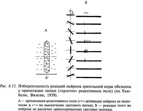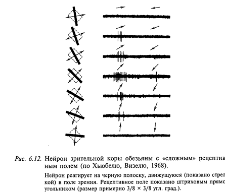 Кроме нейронов с «простыми» рецептивными полями, в зрительной коре млекопитающих описаны нейроны, избирательно чувствительные к ориентированным стимулам, но не имеющие в рецептивном поле четко выраженных антагонистических зон. Нейроны этого типа имеют слабую реакцию при стимуляции их рецептивного поля точечным стимулом, но зато хорошо реагируют на оптимально ориентированные полоски. Такая же полоска с другой (не оптимальной) ориентацией либо не вызывает реакции, либо эти реакции очень слабые. Таким образом, торможение реакции возникает при стимуляции тех же участков рецептивного поля, которые при действии оптимально ориентированного стимула ведут себя как возбуждающие. Эти нейроны имеют «сложные» рецептивные поля (рис. 6.12). Характерным свойством нейронов с такими рецептивными полями является их способность реагировать на рисунки, не содержащие определенным образом ориентированных линий, например, беспорядочно чередующиеся светлые и темные пятна нерегулярной формы. Это свойство сложных нейронов в сочетании с их относительно слабой избирательностью может указывать на то, что они приспособлены для выделения сложных зрительных стимулов. Кроме двух указанных выше типов рецептивных полей, у корковых нейронов описаны также сверхсложные рецептивные поля. Для оптимальной стимуляции сверхсложного нейрона важно, чтобы стимулирующая полоска была не только оптимально ориентирована, но и имела бы оптимальную длину. Увеличение длины полоски сверх определенной длины приводит к торможению реакции нейрона. Это происходит вследствие наличия в их рецептивном поле дополнительных «фланговых» тормозных зон на краях рецептивного поля. Рецептивное поле сверхсложного нейрона может иметь одну или две тормозные фланговые зоны. В связи с этим для максимального возбуждения нейрона необходимо ограничить длину полоски либо с одной стороны, либо с обеих. В первом случае нейрон становится чувствительным к появлению в его рецептивном поле углов. Во втором случае он максимально активируется на определенный размер стимула (его длина ограничивается расстоянием между двумя фланговыми зонами). Основой бинокулярного стереоскопического зрения является диспаратность - оценка различия проекций изображений на сетчатках обоих глаз. Известно, что 84% нейронов зрительной коры бинокулярны. Они реагируют при одновременной стимуляции двух сетчаток, при этом нейроны одной колонки имеют близкие значения диспаратности. Благодаря тому, что правый и левый глаза рассматривают один и тот же объект с разных точек, изображения объекта на правой и левой сетчатке сдвинуты относительно друг друга. Это различие изображений зависит от того, насколько приближен или отдален объект относительно точки пересечения оптических осей двух глаз (точка фиксации). Нейрофизиологической основой бинокулярного зрения является взаимодействие двух рецептивных полей, которые имеются у каждого бинокулярного нейрона зрительной коры (на контра - и ипсилатеральной сетчатке). Каждый бинокулярный нейрон избирателен к какой-то одной определенной диспаратности (это определяется диспаратностью его рецептивных полей), а поскольку диспаратность зависит от удаленности объекта, реакции бинокулярных нейронов оказываются избирательными к определенной удаленности. В коре имеет
