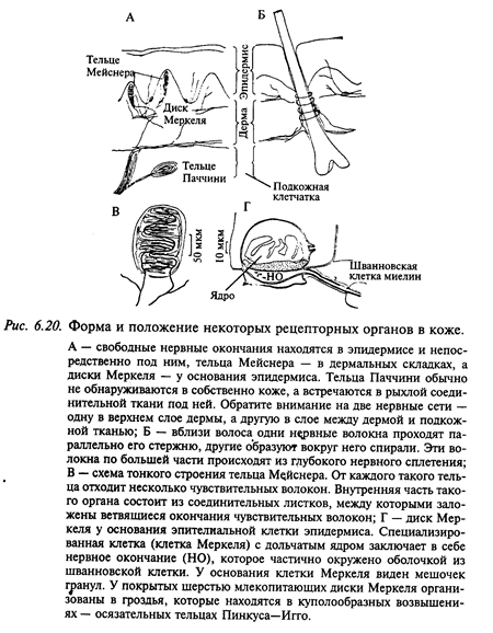 Инкапсулированные окончания составляют важный класс рецепторов кожи. Роль капсулы из соединительной ткани весьма значительна в формировании реакции рецептора. В настоящее время выделяют следующие инкапсулированные окончания кожи: диски Меркеля, тельца Мейснера, тельца Паччини, окончания Руффини. При изучении свойств кожных рецепторов трудно бывает сопоставить их физиологические характеристики с данными гистологии. Это связано с тем, что при регистрации биоэлектрической активности от афферентного волокна достаточно просто и надежно можно определить рецептивное поле данного афферентного волокна, но в этом поле могут находиться сотни рецепторов, которые передают информацию по другим афферентным волокнам. Поэтому очень трудно сопоставить тип реакции афферента с морфологическими типами рецепторов в данном участке кожи. Другими словами, можно дать физиологическую классификацию по реакциям на стимулы и распределить наблюдаемые под микроскопом рецепторы по морфологическим классам. Однако сопоставить функциональную и анатомическую классификации удается далеко не всегда. На рис. 6.20 схематически показаны те виды рецепторов, которые можно обнаружить у млекопитающих в коже, покрытой волосами (А) и не покрытой волосами (Б). Рецепторы кожи можно разделить на быстро адаптирующиеся, или фазические (например, тельца Паччини); медленно адаптирующиеся, или тонические (например, диски Меркеля, окончания Руффини), и имеющие среднюю скорость адаптации, или фазно-тонические (например, рецепторы волосяных луковиц, тельца Мейснера). Проприорецепторы. Известно, что млекопитающие могут достаточно точно оценивать положение конечностей, головы и туловища в пространстве. Кроме этого, достаточно точно оцениваются величина сопротивления каждому движению, углы суставов, скорость их изменения и пр. Такая оценка становится возможной благодаря рецепторам, которые находятся в мышцах, сухожилиях, суставах и называются проприорецепторами. Выше были описаны физиологические особенности двух проприорецепторов - мышечных веретен и сухожильных рецепторов. Сигналы от рецепторов кожи, мышц, суставов, сухожилий и внутренних органов поступают через задние корешки в спинной мозг. Здесь эта информация обрабатывается и отсюда передается в верхние (супраспинальные) этажи ЦНС: ядра вентробазального таламуса и далее в кору больших полушарий. Механорецепция объединяет четыре качества: ощущение давления, прикосновения, вибрации и щекотания. Изучают механорецепцию одним из классических методов: прикосновение к коже волосками, или щетинками, позволило установить, что даже легкое надавливание (в диапазоне 0,1-0,5 г, что приводит к вдавливанию кожи всего на 0,1-0,01 мм) вызывает ощущение прикосновения или давления. Но эти ощущения возникают только при надавливании в определенных точках, например кожи ладони. Эти точки называются тактильными точками. Участки кожи с большой плотностью тактильных точек находятся на кончиках пальцев и на губах. Плотность тактильных точек на животе, спине и плечах очень низкая. Используя ножки специального циркуля (с тупыми концами, чтобы избежать болевого раздражения), можно определять пороги пространственного различения, т.е. минимальные расстояния между двумя одновременными тактильными стимулами, при которых их удается во