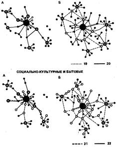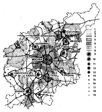 Рис. 16.Принципиальная схема перспективного расселения на территории Центрального экономического района Границы: 1- экономического района; 2 — областей; 3 - групповых систем населенных мест); 4 – центральных ядер этих систем; 5- охраняемых природных ландшафтов; 6 – ограничения роста городов; 7 – сдерживаемого развития городов; 8 – основные транспортные магистрали; 9 — центр экономическогорайона (крупнейшийгород); 10, 11 — подцентры экономического района (крупнейший и крупный город); 12, 13 — центры крупных и средних групповых систем; 14, 15, 16 – подцентры групповых систем населенных мест; 17, 18, 19 – опорные центры межселенного обслуживания вне групповых систем населенных мест (средние, малые города и поселки городского типа) Под групповыми системами населенных мест (ГСНМ) принято подразумевать целенаправленно формируемые группы городских и сельских поселений различной величины и народнохозяйственного профиля, объединенные развитыми территориально-производственными связями, общей инженерной инфраструктурой, единой сетью общественных центров социально-культурного обслуживания и мест отдыха населения. В границах указанных систем в перспективе должно быть достигнуто относительно полное и равномерное удовлетворение потребностей населения в выборе мест приложения труда, в получении образования, культурно-бытового обслуживания и проведения досуга населения по месту его постоянного проживания. Существуют крупные, средние и малые групповые системы населенных мест. Основной признак крупной групповой системы – наличие в ее приделах необходимых инженерно-технических и социально-экономических предпосылок для всестороннего развития процесса внутрисистемной интеграции и специализации населенных мест (рис.1 а.). Для районов, в пределах которых отсутствуют крупные (крупнейшие) города и ли городские агломерации, становится задача включения максимально большего числа городских поселений в состав средних групповых систем населенных мест, формирующихся на базе больших городов или городских агломераций. В пределах систем этого типа к концу расчетного срока должно быть обеспечено удовлетворение всех видов потребностей населения в стандартных услугах и частично удовлетворены его потребности в нестандартных видах обслуживания и специализированных местах приложения труда (рис.1б). Под малыми групповыми системами понимаются такие группы поселений, в пределах которых на ближайшую перспективу не представляется возможным создать существенные социально-экономические и инфраструктурные предпосылки для многофункциональной интеграции населенных мест. Главная экономическая цель формирования групповых систем населенных мест заключается в создании широких градостроительных предпосылок для интенсификации производства в составе территориально-производственных комплексов разного типа и повышения эффективности капиталовложений в городское и сельское производство. Главная экологическая цель формирования групповых систем населенных мест заключается в обеспечении оптимальных условия для развития всех населенных мест и производственных объектов, расположенных на территории системы, с точки зрения охраны окружающей природной среды.